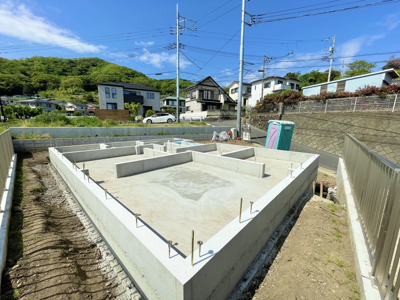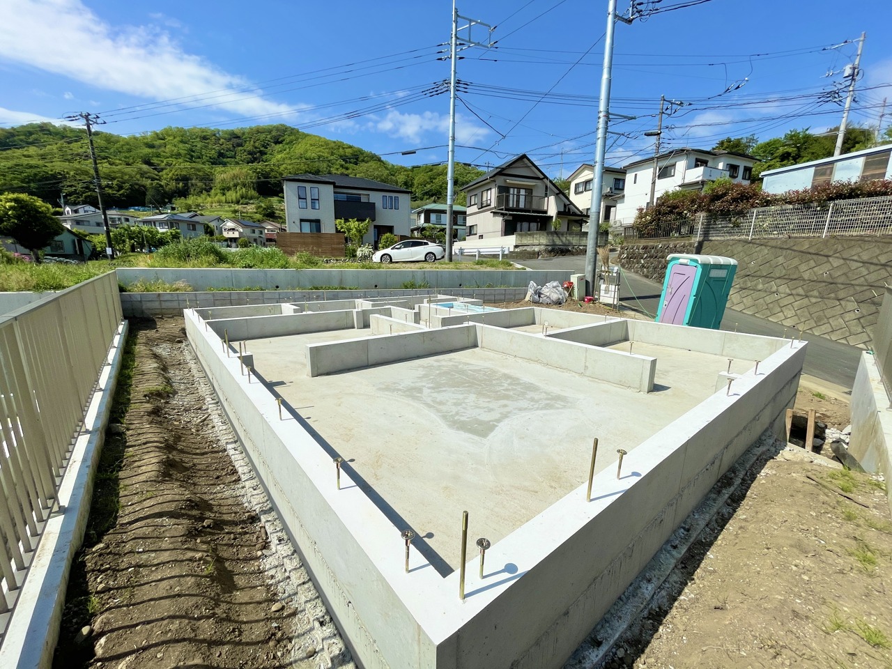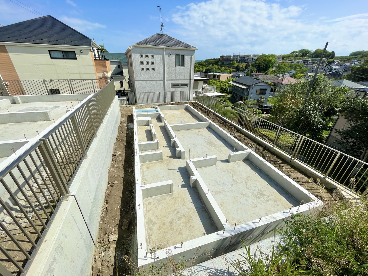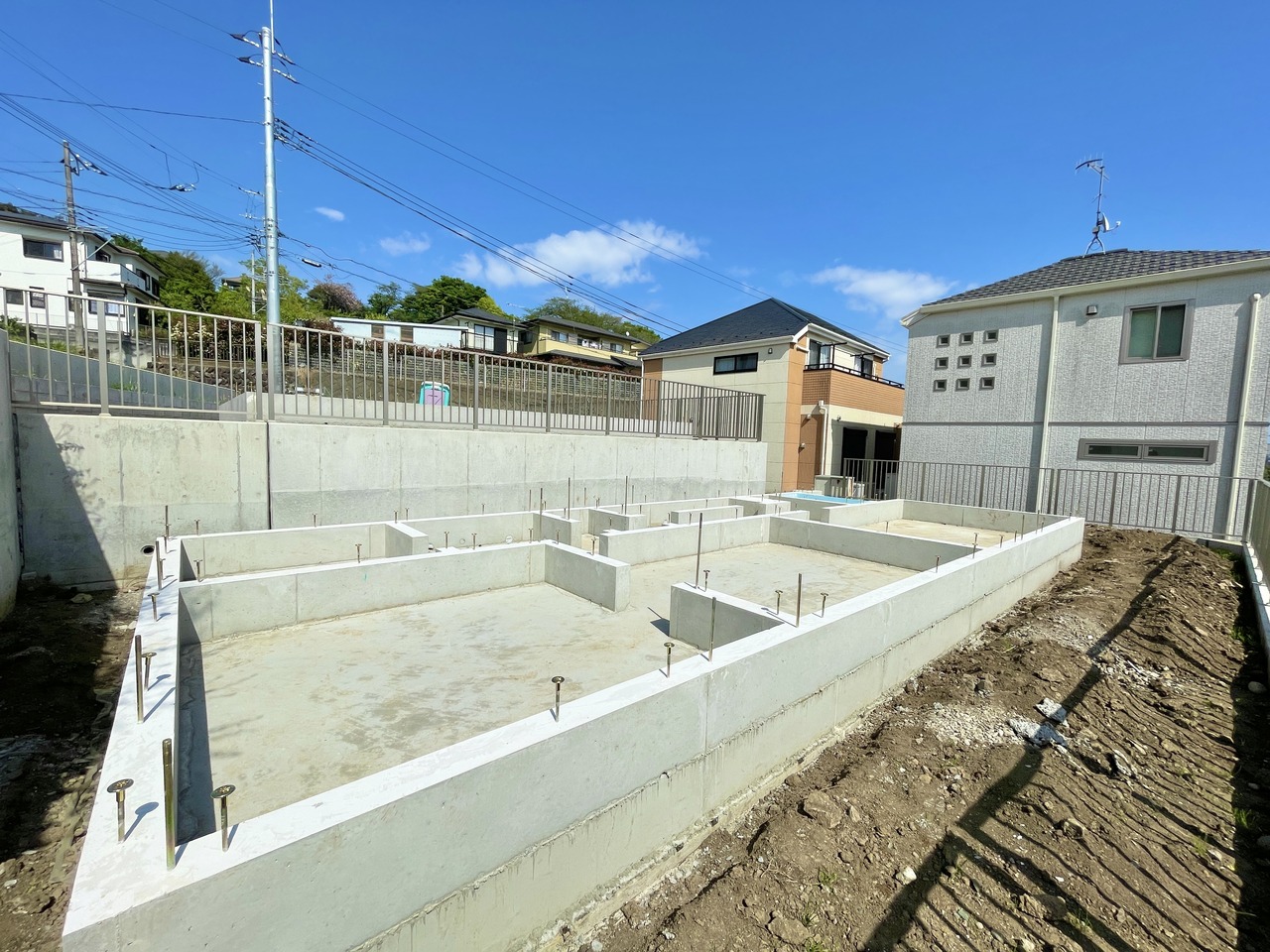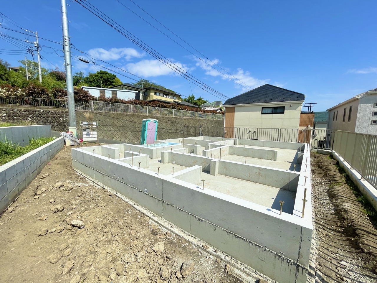 1号棟 整った分譲地に基礎が並び、これから街並みが生まれていく現地です。周辺は落ち着いた住宅街で、陽当たりや風通しもチェックしやすい環境。完成後の暮らしを想像しながら、住み心地や動線をイメージできる今だけのタイミングです。