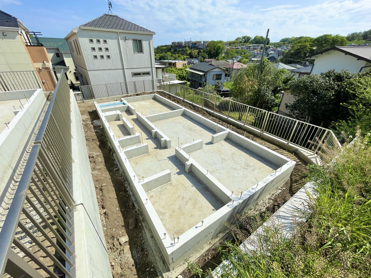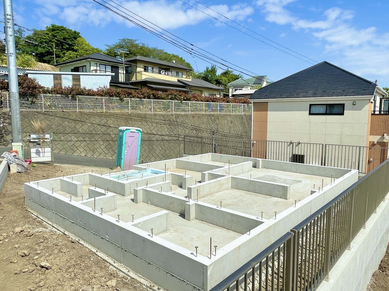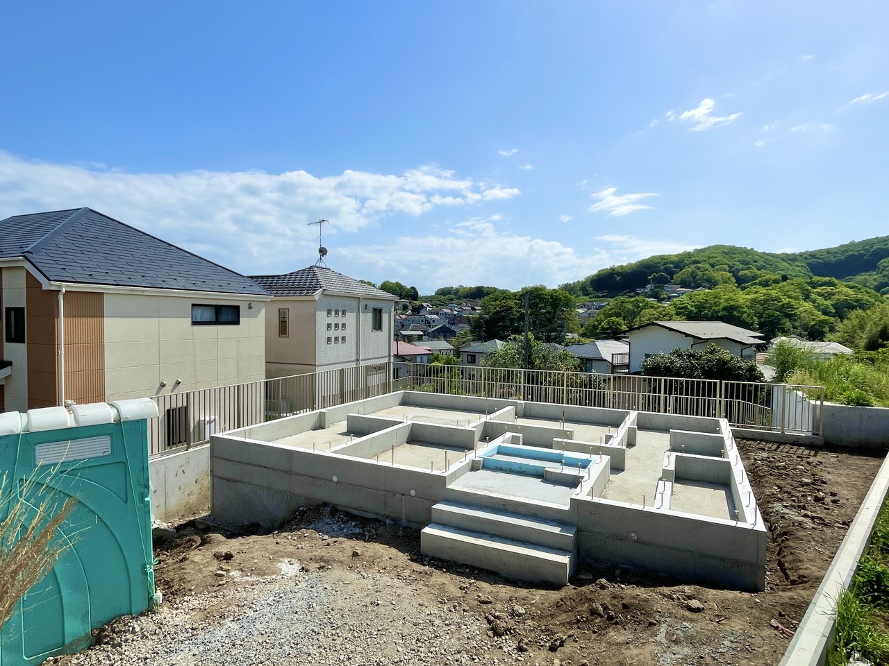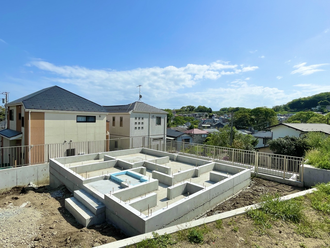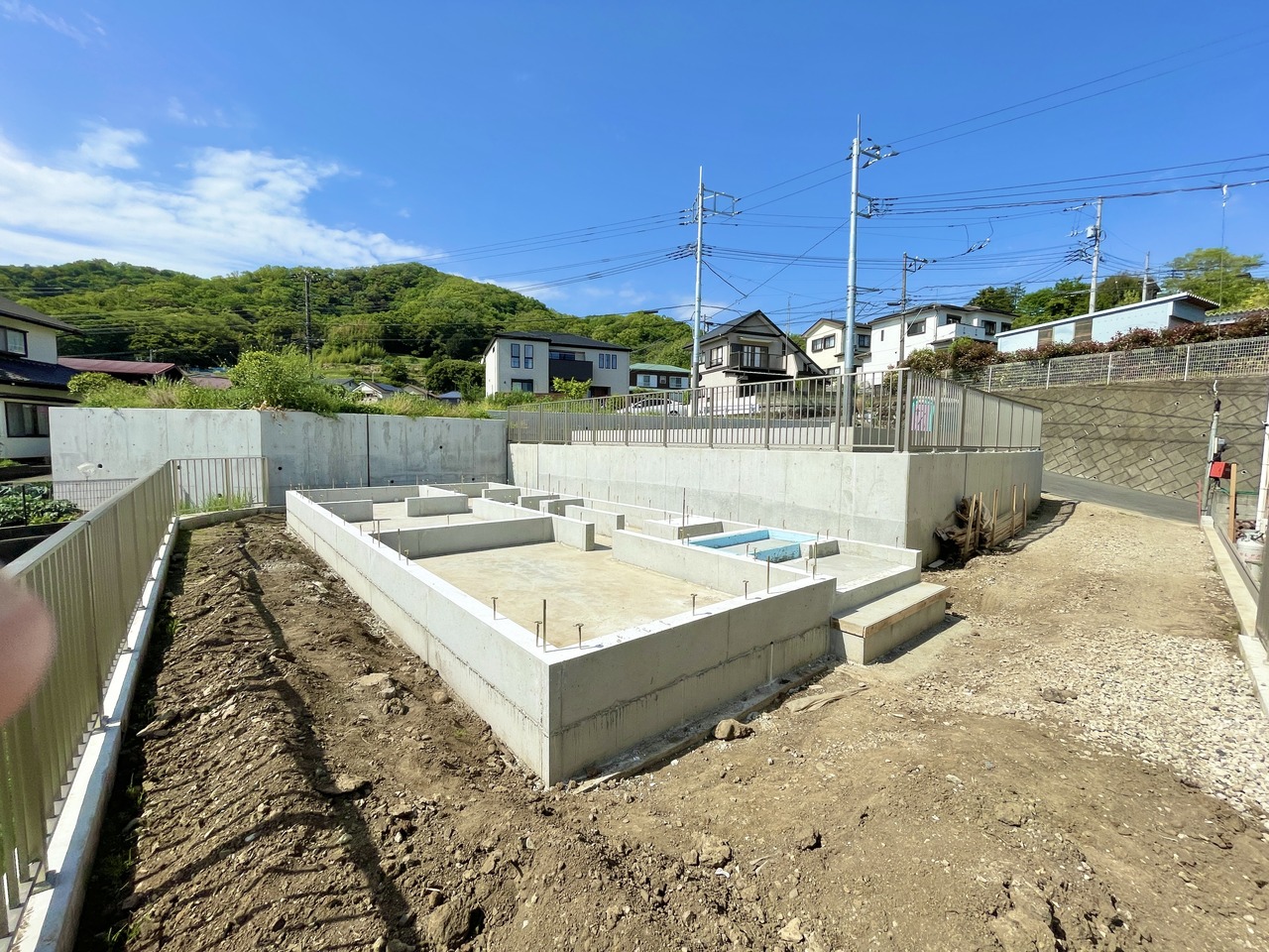 1号棟 整った分譲地に基礎が並び、これから街並みが生まれていく現地です。周辺は落ち着いた住宅街で、陽当たりや風通しもチェックしやすい環境。完成後の暮らしを想像しながら、住み心地や動線をイメージできる今だけのタイミングです。