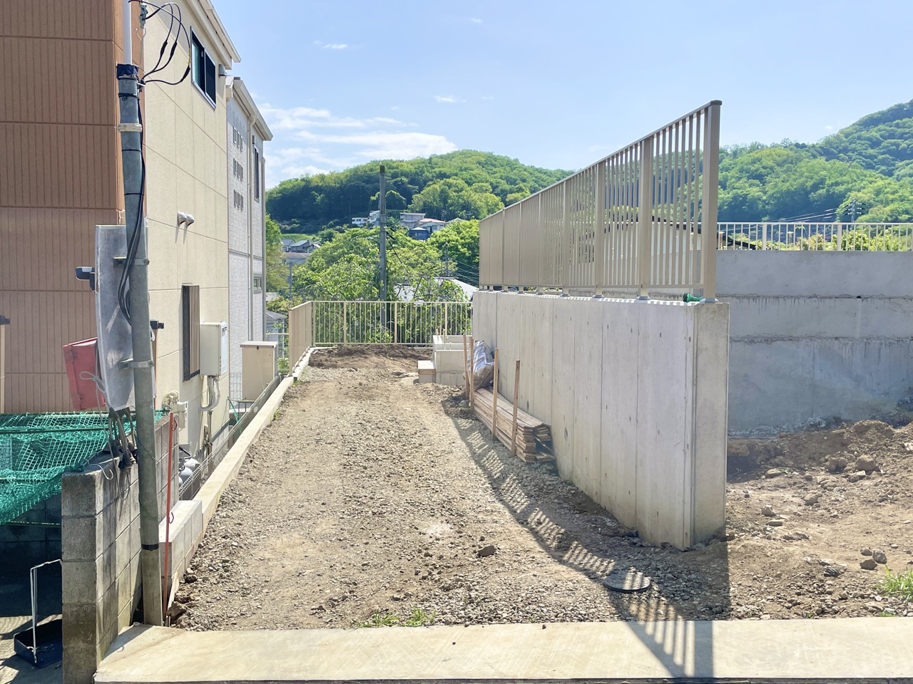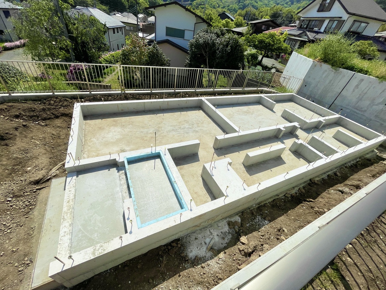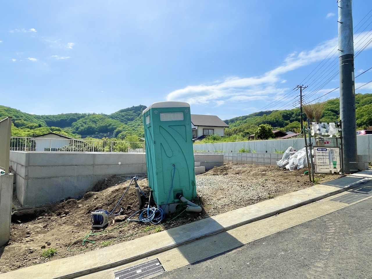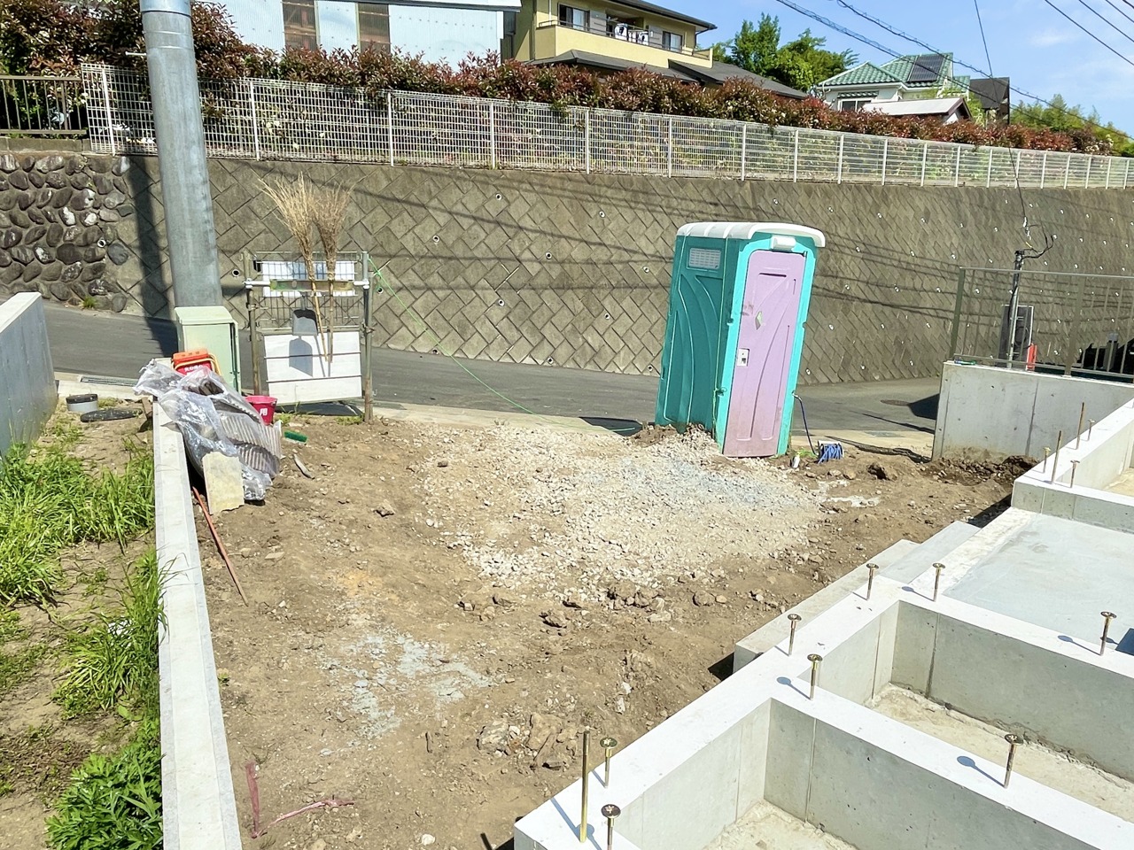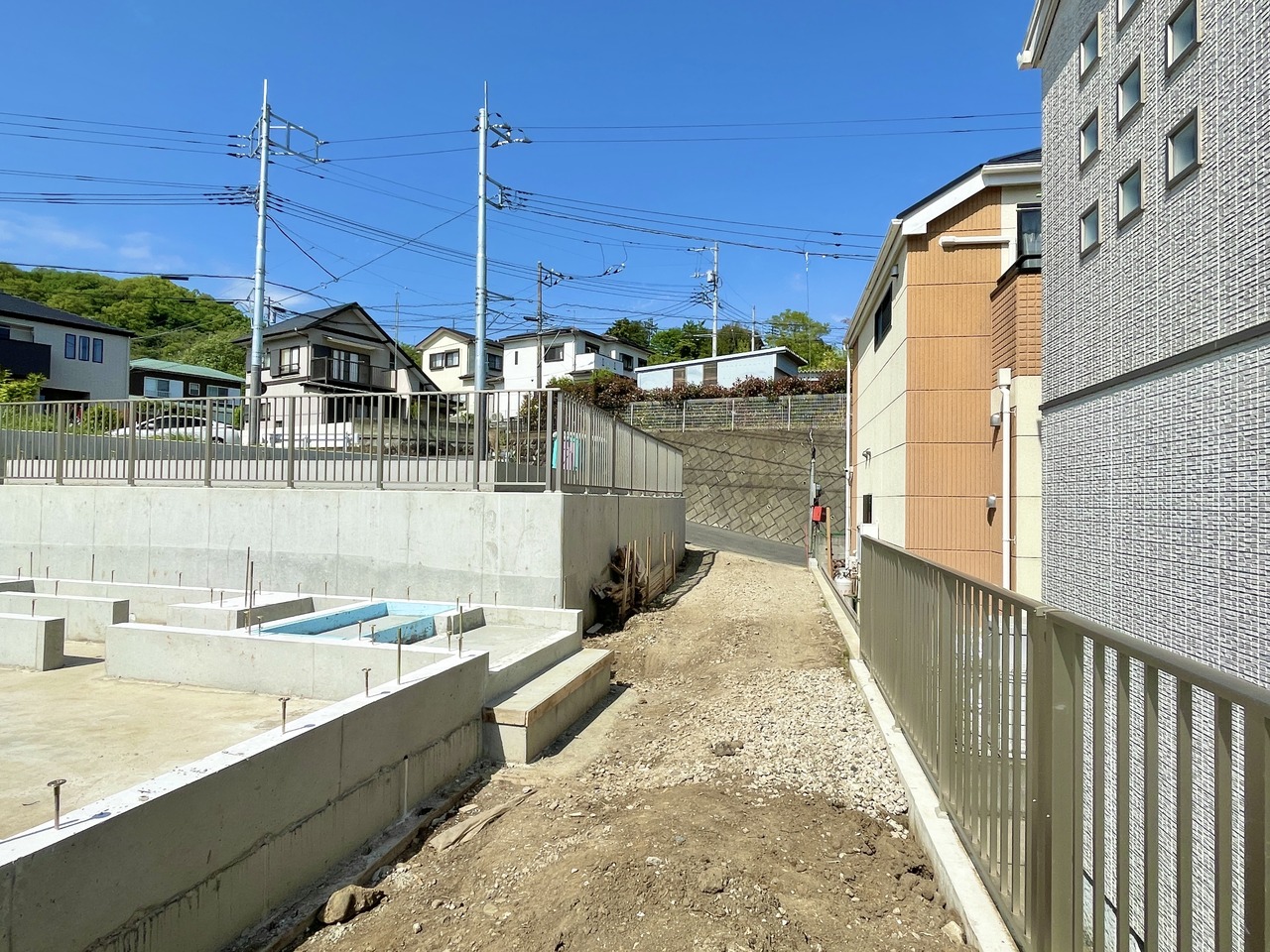1号棟 整った分譲地に基礎が並び、これから街並みが生まれていく現地です。周辺は落ち着いた住宅街で、陽当たりや風通しもチェックしやすい環境。完成後の暮らしを想像しながら、住み心地や動線をイメージできる今だけのタイミングです。